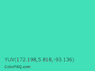 YUV 172.198,5.818,-93.136 Color is a normal cyan color and the nearest color is Eucalyptus #44d7a8. Hex code #42e0b8 and RGB value is rgb(66,224,184). In RGB color space, this color is composed of 26% red, 88% green, 72% blue, In CMYK color space, this color is composed of 71% cyan, 0% magenta, 18% yellow , 12% black , In HSL color space, this color has a hue angle of 165° , 72% saturation and 57% lightness.