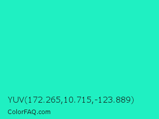 YUV 172.265,10.715,-123.889 Color is a normal cyan color and the nearest color is Turquoise PWG #30d5c8. Hex code #1ff0c2 and RGB value is rgb(31,240,194). In RGB color space, this color is composed of 12% red, 94% green, 76% blue, In CMYK color space, this color is composed of 87% cyan, 0% magenta, 19% yellow , 6% black , In HSL color space, this color has a hue angle of 167° , 87% saturation and 53% lightness.
