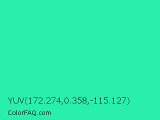 YUV 172.274,0.358,-115.127 Color is a normal green color and the nearest color is Eucalyptus #44d7a8. Hex code #29efad and RGB value is rgb(41,239,173). In RGB color space, this color is composed of 16% red, 94% green, 68% blue, In CMYK color space, this color is composed of 83% cyan, 0% magenta, 28% yellow , 6% black , In HSL color space, this color has a hue angle of 160° , 86% saturation and 55% lightness.