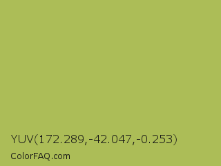 YUV 172.289,-42.047,-0.253 Color is a normal yellow color and the nearest color is Middle Green Yellow #acbf60. Hex code #acbd57 and RGB value is rgb(172,189,87). In RGB color space, this color is composed of 67% red, 74% green, 34% blue, In CMYK color space, this color is composed of 9% cyan, 0% magenta, 54% yellow , 26% black , In HSL color space, this color has a hue angle of 70° , 44% saturation and 54% lightness.