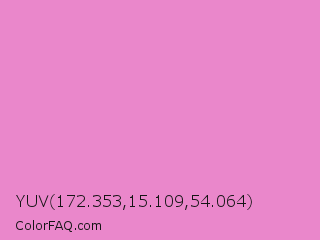 YUV 172.353,15.109,54.064 Color is a light magenta color and the nearest color is Shocking #e292c0. Hex code #ea87cb and RGB value is rgb(234,135,203). In RGB color space, this color is composed of 92% red, 53% green, 80% blue, In CMYK color space, this color is composed of 0% cyan, 42% magenta, 13% yellow , 8% black , In HSL color space, this color has a hue angle of 319° , 70% saturation and 72% lightness.