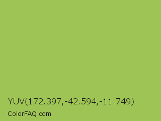 YUV 172.397,-42.594,-11.749 Color is a normal green color and the nearest color is Middle Green Yellow #acbf60. Hex code #9fc456 and RGB value is rgb(159,196,86). In RGB color space, this color is composed of 62% red, 77% green, 34% blue, In CMYK color space, this color is composed of 19% cyan, 0% magenta, 56% yellow , 23% black , In HSL color space, this color has a hue angle of 80° , 48% saturation and 55% lightness.