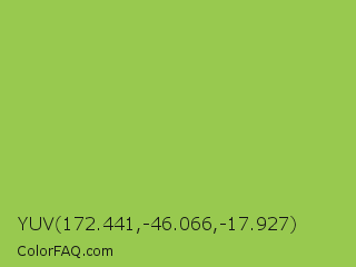 YUV 172.441,-46.066,-17.927 Color is a normal green color and the nearest color is Android Green #a4c639. Hex code #98c94f and RGB value is rgb(152,201,79). In RGB color space, this color is composed of 60% red, 79% green, 31% blue, In CMYK color space, this color is composed of 24% cyan, 0% magenta, 61% yellow , 21% black , In HSL color space, this color has a hue angle of 84° , 53% saturation and 55% lightness.