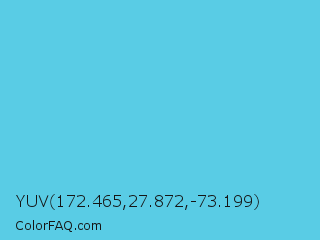 YUV 172.465,27.872,-73.199 Color is a light cyan color and the nearest color is Viking #64ccdb. Hex code #59cce5 and RGB value is rgb(89,204,229). In RGB color space, this color is composed of 35% red, 80% green, 90% blue, In CMYK color space, this color is composed of 61% cyan, 11% magenta, 0% yellow , 10% black , In HSL color space, this color has a hue angle of 191° , 73% saturation and 62% lightness.