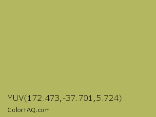 YUV 172.473,-37.701,5.724 Color is a normal yellow color and the nearest color is Olive Green #b5b35c. Hex code #b3b860 and RGB value is rgb(179,184,96). In RGB color space, this color is composed of 70% red, 72% green, 38% blue, In CMYK color space, this color is composed of 3% cyan, 0% magenta, 48% yellow , 28% black , In HSL color space, this color has a hue angle of 63° , 38% saturation and 55% lightness.
