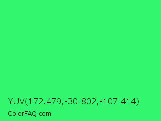 YUV 172.479,-30.802,-107.414 Color is a normal green color and the nearest color is UFO Green #3cd070. Hex code #32f76e and RGB value is rgb(50,247,110). In RGB color space, this color is composed of 20% red, 97% green, 43% blue, In CMYK color space, this color is composed of 80% cyan, 0% magenta, 55% yellow , 3% black , In HSL color space, this color has a hue angle of 138° , 92% saturation and 58% lightness.