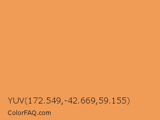YUV 172.549,-42.669,59.155 Color is a light orange color and the nearest color is Tan Hide #fa9d5a. Hex code #f09b56 and RGB value is rgb(240,155,86). In RGB color space, this color is composed of 94% red, 61% green, 34% blue, In CMYK color space, this color is composed of 0% cyan, 35% magenta, 64% yellow , 6% black , In HSL color space, this color has a hue angle of 27° , 84% saturation and 64% lightness.