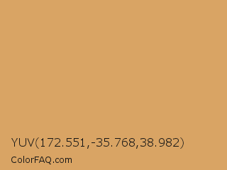 YUV 172.551,-35.768,38.982 Color is a light orange color and the nearest color is Earth Yellow #e1a95f. Hex code #d9a464 and RGB value is rgb(217,164,100). In RGB color space, this color is composed of 85% red, 64% green, 39% blue, In CMYK color space, this color is composed of 0% cyan, 24% magenta, 54% yellow , 15% black , In HSL color space, this color has a hue angle of 33° , 61% saturation and 62% lightness.