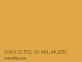 YUV 172.572,-51.061,44.225 Color is a normal orange color and the nearest color is Anzac #e0b646. Hex code #dfa745 and RGB value is rgb(223,167,69). In RGB color space, this color is composed of 87% red, 65% green, 27% blue, In CMYK color space, this color is composed of 0% cyan, 25% magenta, 69% yellow , 13% black , In HSL color space, this color has a hue angle of 38° , 71% saturation and 57% lightness.