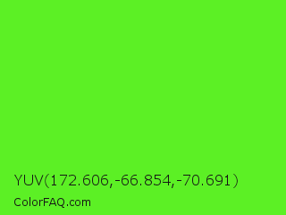 YUV 172.606,-66.854,-70.691 Color is a normal green color and the nearest color is Bright Green #66ff00. Hex code #5cf025 and RGB value is rgb(92,240,37). In RGB color space, this color is composed of 36% red, 94% green, 15% blue, In CMYK color space, this color is composed of 62% cyan, 0% magenta, 85% yellow , 6% black , In HSL color space, this color has a hue angle of 104° , 87% saturation and 54% lightness.