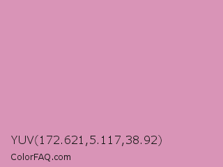 YUV 172.621,5.117,38.92 Color is a light rose color and the nearest color is Shocking #e292c0. Hex code #d994b7 and RGB value is rgb(217,148,183). In RGB color space, this color is composed of 85% red, 58% green, 72% blue, In CMYK color space, this color is composed of 0% cyan, 32% magenta, 16% yellow , 15% black , In HSL color space, this color has a hue angle of 330° , 48% saturation and 72% lightness.