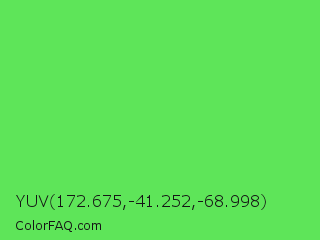 YUV 172.675,-41.252,-68.998 Color is a light green color and the nearest color is Screamin Green #66ff66. Hex code #5ee559 and RGB value is rgb(94,229,89). In RGB color space, this color is composed of 37% red, 90% green, 35% blue, In CMYK color space, this color is composed of 59% cyan, 0% magenta, 61% yellow , 10% black , In HSL color space, this color has a hue angle of 118° , 73% saturation and 62% lightness.