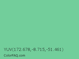 YUV 172.678,-8.715,-51.461 Color is a light green color and the nearest color is De York #7ac488. Hex code #72ce9b and RGB value is rgb(114,206,155). In RGB color space, this color is composed of 45% red, 81% green, 61% blue, In CMYK color space, this color is composed of 45% cyan, 0% magenta, 25% yellow , 19% black , In HSL color space, this color has a hue angle of 147° , 48% saturation and 63% lightness.