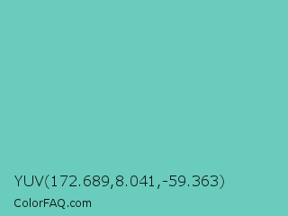 YUV 172.689,8.041,-59.363 Color is a light cyan color and the nearest color is Downy #6fd0c5. Hex code #69ccbd and RGB value is rgb(105,204,189). In RGB color space, this color is composed of 41% red, 80% green, 74% blue, In CMYK color space, this color is composed of 49% cyan, 0% magenta, 7% yellow , 20% black , In HSL color space, this color has a hue angle of 171° , 49% saturation and 61% lightness.