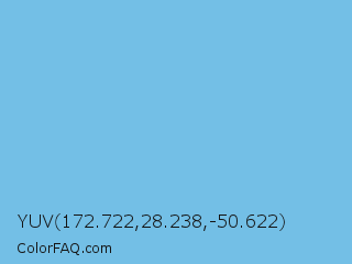 YUV 172.722,28.238,-50.622 Color is a light blue color and the nearest color is Aero #7cb9e8. Hex code #73bfe6 and RGB value is rgb(115,191,230). In RGB color space, this color is composed of 45% red, 75% green, 90% blue, In CMYK color space, this color is composed of 50% cyan, 17% magenta, 0% yellow , 10% black , In HSL color space, this color has a hue angle of 200° , 70% saturation and 68% lightness.