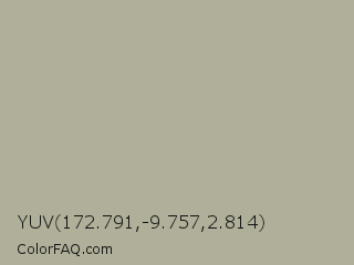 YUV 172.791,-9.757,2.814 Color is a light yellow color and the nearest color is Taupe Gray #b3af95. Hex code #b0af99 and RGB value is rgb(176,175,153). In RGB color space, this color is composed of 69% red, 69% green, 60% blue, In CMYK color space, this color is composed of 0% cyan, 1% magenta, 13% yellow , 31% black , In HSL color space, this color has a hue angle of 57° , 13% saturation and 65% lightness.