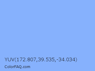 YUV 172.807,39.535,-34.034 Color is a light blue color and the nearest color is Jordy Blue #8ab9f1. Hex code #86b1fd and RGB value is rgb(134,177,253). In RGB color space, this color is composed of 53% red, 69% green, 99% blue, In CMYK color space, this color is composed of 47% cyan, 30% magenta, 0% yellow , 1% black , In HSL color space, this color has a hue angle of 218° , 97% saturation and 76% lightness.