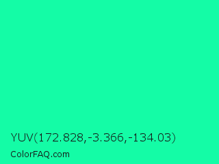 YUV 172.828,-3.366,-134.03 Color is a normal green color and the nearest color is Medium Spring Green #00fa9a. Hex code #14fca6 and RGB value is rgb(20,252,166). In RGB color space, this color is composed of 8% red, 99% green, 65% blue, In CMYK color space, this color is composed of 92% cyan, 0% magenta, 34% yellow , 1% black , In HSL color space, this color has a hue angle of 158° , 97% saturation and 53% lightness.