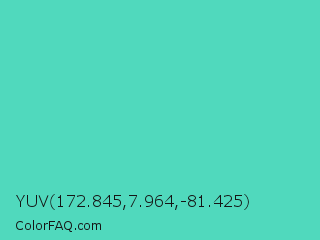YUV 172.845,7.964,-81.425 Color is a normal cyan color and the nearest color is Medium Turquoise #48d1cc. Hex code #50d9bd and RGB value is rgb(80,217,189). In RGB color space, this color is composed of 31% red, 85% green, 74% blue, In CMYK color space, this color is composed of 63% cyan, 0% magenta, 13% yellow , 15% black , In HSL color space, this color has a hue angle of 168° , 64% saturation and 58% lightness.