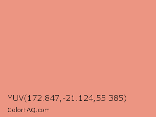 YUV 172.847,-21.124,55.385 Color is a light red color and the nearest color is Dark Salmon #e9967a. Hex code #ec9582 and RGB value is rgb(236,149,130). In RGB color space, this color is composed of 93% red, 58% green, 51% blue, In CMYK color space, this color is composed of 0% cyan, 37% magenta, 45% yellow , 7% black , In HSL color space, this color has a hue angle of 11° , 74% saturation and 72% lightness.