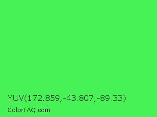 YUV 172.859,-43.807,-89.33 Color is a light green color and the nearest color is Screamin Green #66ff66. Hex code #47f254 and RGB value is rgb(71,242,84). In RGB color space, this color is composed of 28% red, 95% green, 33% blue, In CMYK color space, this color is composed of 71% cyan, 0% magenta, 65% yellow , 5% black , In HSL color space, this color has a hue angle of 125° , 87% saturation and 61% lightness.
