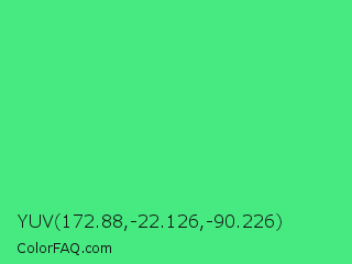 YUV 172.88,-22.126,-90.226 Color is a normal green color and the nearest color is Very Light Malachite Green #64e986. Hex code #46ea80 and RGB value is rgb(70,234,128). In RGB color space, this color is composed of 27% red, 92% green, 50% blue, In CMYK color space, this color is composed of 70% cyan, 0% magenta, 45% yellow , 8% black , In HSL color space, this color has a hue angle of 141° , 80% saturation and 60% lightness.
