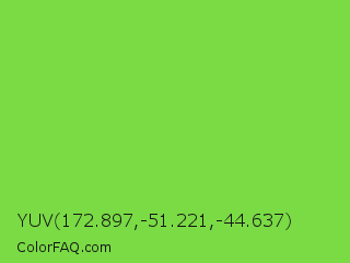 YUV 172.897,-51.221,-44.637 Color is a normal green color and the nearest color is Kiwi #8ee53f. Hex code #7adb45 and RGB value is rgb(122,219,69). In RGB color space, this color is composed of 48% red, 86% green, 27% blue, In CMYK color space, this color is composed of 44% cyan, 0% magenta, 68% yellow , 14% black , In HSL color space, this color has a hue angle of 99° , 68% saturation and 56% lightness.