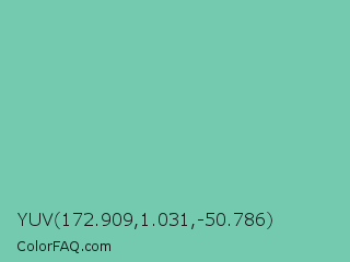 YUV 172.909,1.031,-50.786 Color is a light green color and the nearest color is Downy #6fd0c5. Hex code #73caaf and RGB value is rgb(115,202,175). In RGB color space, this color is composed of 45% red, 79% green, 69% blue, In CMYK color space, this color is composed of 43% cyan, 0% magenta, 13% yellow , 21% black , In HSL color space, this color has a hue angle of 161° , 45% saturation and 62% lightness.