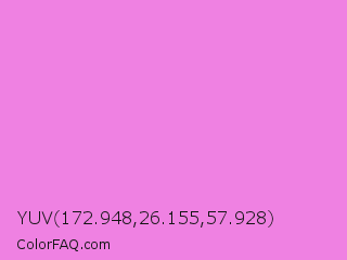 YUV 172.948,26.155,57.928 Color is a light magenta color and the nearest color is Pale Magenta #f984e5. Hex code #ef81e2 and RGB value is rgb(239,129,226). In RGB color space, this color is composed of 94% red, 51% green, 89% blue, In CMYK color space, this color is composed of 0% cyan, 46% magenta, 5% yellow , 6% black , In HSL color space, this color has a hue angle of 307° , 77% saturation and 72% lightness.