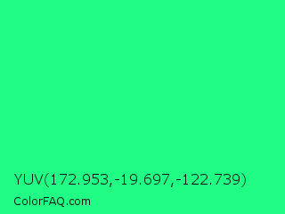 YUV 172.953,-19.697,-122.739 Color is a normal green color and the nearest color is Spring Green #00ff7f. Hex code #21fc85 and RGB value is rgb(33,252,133). In RGB color space, this color is composed of 13% red, 99% green, 52% blue, In CMYK color space, this color is composed of 87% cyan, 0% magenta, 47% yellow , 1% black , In HSL color space, this color has a hue angle of 147° , 97% saturation and 56% lightness.