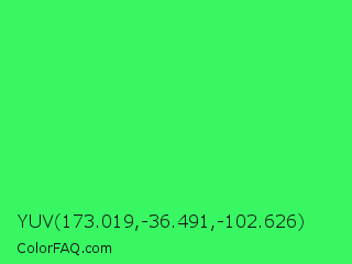 YUV 173.019,-36.491,-102.626 Color is a normal green color and the nearest color is UFO Green #3cd070. Hex code #38f763 and RGB value is rgb(56,247,99). In RGB color space, this color is composed of 22% red, 97% green, 39% blue, In CMYK color space, this color is composed of 77% cyan, 0% magenta, 60% yellow , 3% black , In HSL color space, this color has a hue angle of 134° , 92% saturation and 59% lightness.