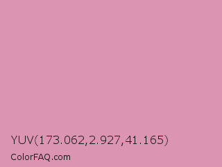 YUV 173.062,2.927,41.165 Color is a light rose color and the nearest color is Light Thulian Pink #e68fac. Hex code #dc94b3 and RGB value is rgb(220,148,179). In RGB color space, this color is composed of 86% red, 58% green, 70% blue, In CMYK color space, this color is composed of 0% cyan, 33% magenta, 19% yellow , 14% black , In HSL color space, this color has a hue angle of 334° , 51% saturation and 72% lightness.