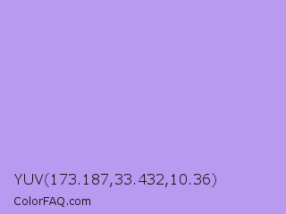YUV 173.187,33.432,10.36 Color is a light violet color and the nearest color is Biloba Flower #b2a1ea. Hex code #b99af1 and RGB value is rgb(185,154,241). In RGB color space, this color is composed of 73% red, 60% green, 95% blue, In CMYK color space, this color is composed of 23% cyan, 36% magenta, 0% yellow , 5% black , In HSL color space, this color has a hue angle of 261° , 76% saturation and 77% lightness.