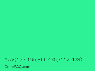 YUV 173.196,-11.436,-112.428 Color is a normal green color and the nearest color is Shamrock #33cc99. Hex code #2df396 and RGB value is rgb(45,243,150). In RGB color space, this color is composed of 18% red, 95% green, 59% blue, In CMYK color space, this color is composed of 81% cyan, 0% magenta, 38% yellow , 5% black , In HSL color space, this color has a hue angle of 152° , 89% saturation and 56% lightness.