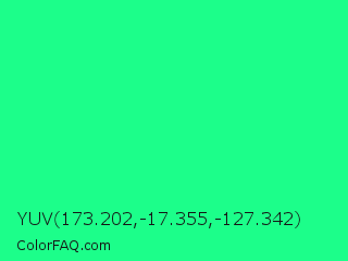 YUV 173.202,-17.355,-127.342 Color is a normal green color and the nearest color is Spring Green #00ff7f. Hex code #1cfe8a and RGB value is rgb(28,254,138). In RGB color space, this color is composed of 11% red, 100% green, 54% blue, In CMYK color space, this color is composed of 89% cyan, 0% magenta, 46% yellow , 0% black , In HSL color space, this color has a hue angle of 149° , 99% saturation and 55% lightness.
