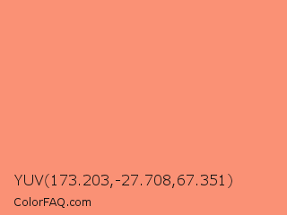 YUV 173.203,-27.708,67.351 Color is a light red color and the nearest color is Salmon #ff8c69. Hex code #fa9175 and RGB value is rgb(250,145,117). In RGB color space, this color is composed of 98% red, 57% green, 46% blue, In CMYK color space, this color is composed of 0% cyan, 42% magenta, 53% yellow , 2% black , In HSL color space, this color has a hue angle of 13° , 93% saturation and 72% lightness.