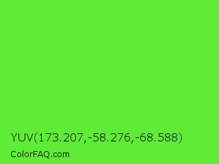 YUV 173.207,-58.276,-68.588 Color is a normal green color and the nearest color is Spring Frost #87ff2a. Hex code #5fec37 and RGB value is rgb(95,236,55). In RGB color space, this color is composed of 37% red, 93% green, 22% blue, In CMYK color space, this color is composed of 60% cyan, 0% magenta, 77% yellow , 7% black , In HSL color space, this color has a hue angle of 107° , 83% saturation and 57% lightness.
