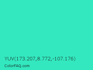 YUV 173.207,8.772,-107.176 Color is a normal cyan color and the nearest color is Turquoise PWG #30d5c8. Hex code #33e8bf and RGB value is rgb(51,232,191). In RGB color space, this color is composed of 20% red, 91% green, 75% blue, In CMYK color space, this color is composed of 78% cyan, 0% magenta, 18% yellow , 9% black , In HSL color space, this color has a hue angle of 166° , 80% saturation and 55% lightness.