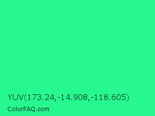 YUV 173.24,-14.908,-118.605 Color is a normal green color and the nearest color is Medium Spring Green #00fa9a. Hex code #26f88f and RGB value is rgb(38,248,143). In RGB color space, this color is composed of 15% red, 97% green, 56% blue, In CMYK color space, this color is composed of 85% cyan, 0% magenta, 42% yellow , 3% black , In HSL color space, this color has a hue angle of 150° , 94% saturation and 56% lightness.