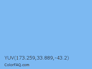 YUV 173.259,33.889,-43.2 Color is a light blue color and the nearest color is Aero #7cb9e8. Hex code #7cb9f2 and RGB value is rgb(124,185,242). In RGB color space, this color is composed of 49% red, 73% green, 95% blue, In CMYK color space, this color is composed of 49% cyan, 24% magenta, 0% yellow , 5% black , In HSL color space, this color has a hue angle of 209° , 82% saturation and 72% lightness.