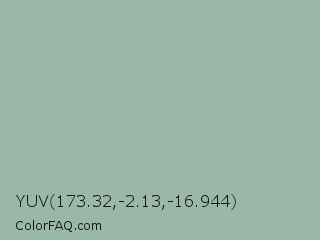 YUV 173.32,-2.13,-16.944 Color is a light green color and the nearest color is Summer Green #96bbab. Hex code #9ab8a9 and RGB value is rgb(154,184,169). In RGB color space, this color is composed of 60% red, 72% green, 66% blue, In CMYK color space, this color is composed of 16% cyan, 0% magenta, 8% yellow , 28% black , In HSL color space, this color has a hue angle of 150° , 17% saturation and 66% lightness.