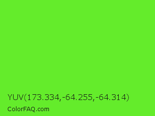 YUV 173.334,-64.255,-64.314 Color is a normal green color and the nearest color is Spring Frost #87ff2a. Hex code #64ec2b and RGB value is rgb(100,236,43). In RGB color space, this color is composed of 39% red, 93% green, 17% blue, In CMYK color space, this color is composed of 58% cyan, 0% magenta, 82% yellow , 7% black , In HSL color space, this color has a hue angle of 102° , 84% saturation and 55% lightness.