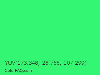 YUV 173.348,-28.766,-107.299 Color is a normal green color and the nearest color is UFO Green #3cd070. Hex code #33f773 and RGB value is rgb(51,247,115). In RGB color space, this color is composed of 20% red, 97% green, 45% blue, In CMYK color space, this color is composed of 79% cyan, 0% magenta, 53% yellow , 3% black , In HSL color space, this color has a hue angle of 140° , 92% saturation and 58% lightness.