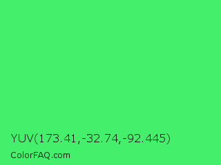 YUV 173.41,-32.74,-92.445 Color is a normal green color and the nearest color is UFO Green #3cd070. Hex code #44f06b and RGB value is rgb(68,240,107). In RGB color space, this color is composed of 27% red, 94% green, 42% blue, In CMYK color space, this color is composed of 72% cyan, 0% magenta, 55% yellow , 6% black , In HSL color space, this color has a hue angle of 134° , 85% saturation and 60% lightness.