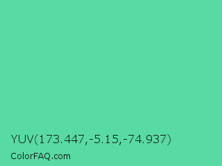 YUV 173.447,-5.15,-74.937 Color is a normal green color and the nearest color is Medium Aquamarine #66ddaa. Hex code #58dba3 and RGB value is rgb(88,219,163). In RGB color space, this color is composed of 35% red, 86% green, 64% blue, In CMYK color space, this color is composed of 60% cyan, 0% magenta, 26% yellow , 14% black , In HSL color space, this color has a hue angle of 154° , 65% saturation and 60% lightness.