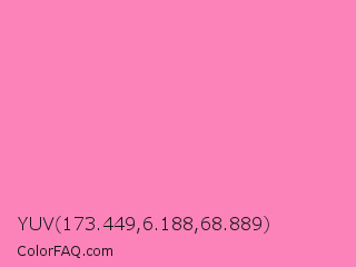 YUV 173.449,6.188,68.889 Color is a light rose color and the nearest color is Persian Pink #f77fbe. Hex code #fc83ba and RGB value is rgb(252,131,186). In RGB color space, this color is composed of 99% red, 51% green, 73% blue, In CMYK color space, this color is composed of 0% cyan, 48% magenta, 26% yellow , 1% black , In HSL color space, this color has a hue angle of 333° , 95% saturation and 75% lightness.