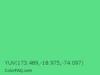 YUV 173.489,-18.975,-74.097 Color is a light green color and the nearest color is Very Light Malachite Green #64e986. Hex code #59e087 and RGB value is rgb(89,224,135). In RGB color space, this color is composed of 35% red, 88% green, 53% blue, In CMYK color space, this color is composed of 60% cyan, 0% magenta, 40% yellow , 12% black , In HSL color space, this color has a hue angle of 140° , 69% saturation and 61% lightness.