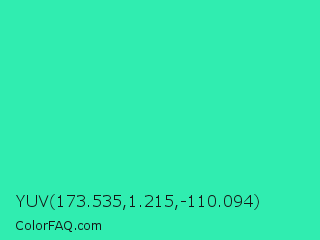 YUV 173.535,1.215,-110.094 Color is a normal green color and the nearest color is Eucalyptus #44d7a8. Hex code #30edb0 and RGB value is rgb(48,237,176). In RGB color space, this color is composed of 19% red, 93% green, 69% blue, In CMYK color space, this color is composed of 80% cyan, 0% magenta, 26% yellow , 7% black , In HSL color space, this color has a hue angle of 161° , 84% saturation and 56% lightness.