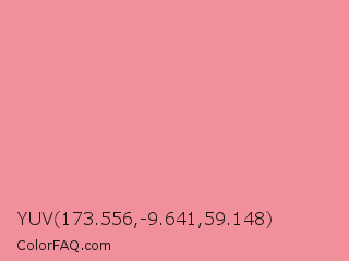 YUV 173.556,-9.641,59.148 Color is a light red color and the nearest color is Sea Pink #ed989e. Hex code #f18f9a and RGB value is rgb(241,143,154). In RGB color space, this color is composed of 95% red, 56% green, 60% blue, In CMYK color space, this color is composed of 0% cyan, 41% magenta, 36% yellow , 5% black , In HSL color space, this color has a hue angle of 353° , 78% saturation and 75% lightness.