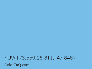 YUV 173.559,28.811,-47.848 Color is a light blue color and the nearest color is Aero #7cb9e8. Hex code #77bee8 and RGB value is rgb(119,190,232). In RGB color space, this color is composed of 47% red, 75% green, 91% blue, In CMYK color space, this color is composed of 49% cyan, 18% magenta, 0% yellow , 9% black , In HSL color space, this color has a hue angle of 202° , 71% saturation and 69% lightness.